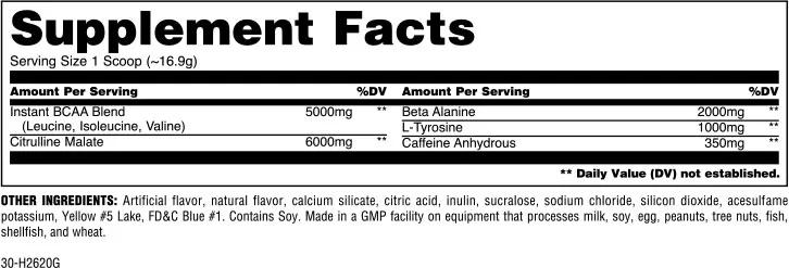 - Includes Citrulline, Beta Alanine, and Caffeine